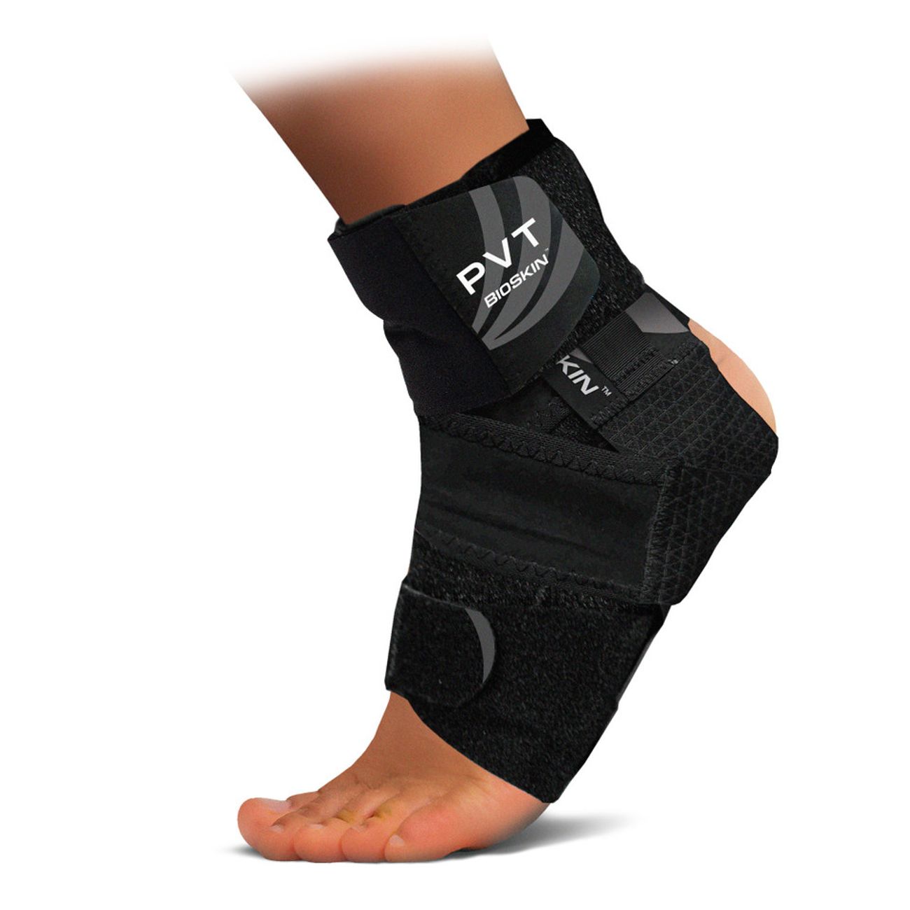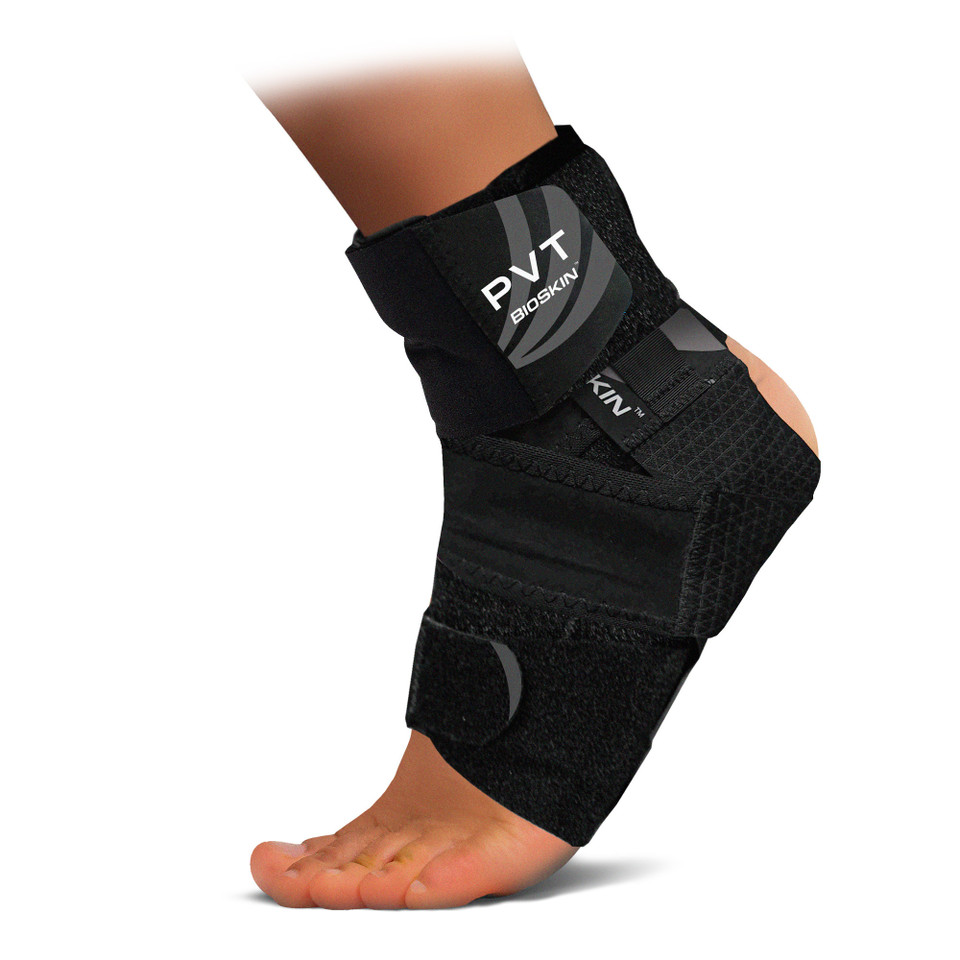 BioSkin PVT Ankelortose er en inovativ ortose som har leddet sidestøtter som følger ankelens anatomiske rotasjonspunkt. Ortosen består av ankelkompresjonssokk med stabiliseringsbånd som går i 8-tall for sidestabilisering og en leddet ramme som kan varmes og formes ved behov for mere individuell passform.